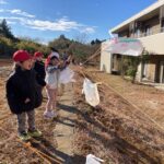 凧あげ、コマ回し、まりつき、羽根つきなど伝承あそびを行うと、特に凧あげが気に入り、ビニール袋に絵を描いて作った手作りの凧を持ち、園庭やひろばでたくさん走ってあそんでいました。