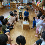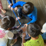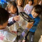 飛行機を順番に飛ばして刺激をしてみるもの、ヤママユはびくともしません。網を持っている子がそっと網に入れると、ヤママユはやっと動き、2つの網を合わせて逃げない様にして、その間に他の子が急いで虫かごを取りに行き、網から虫かごに入れる事も、子ども達で考えながら行っていました。みんなで心がひとつになり、やっと虫かごに入れる事が、出来ました。