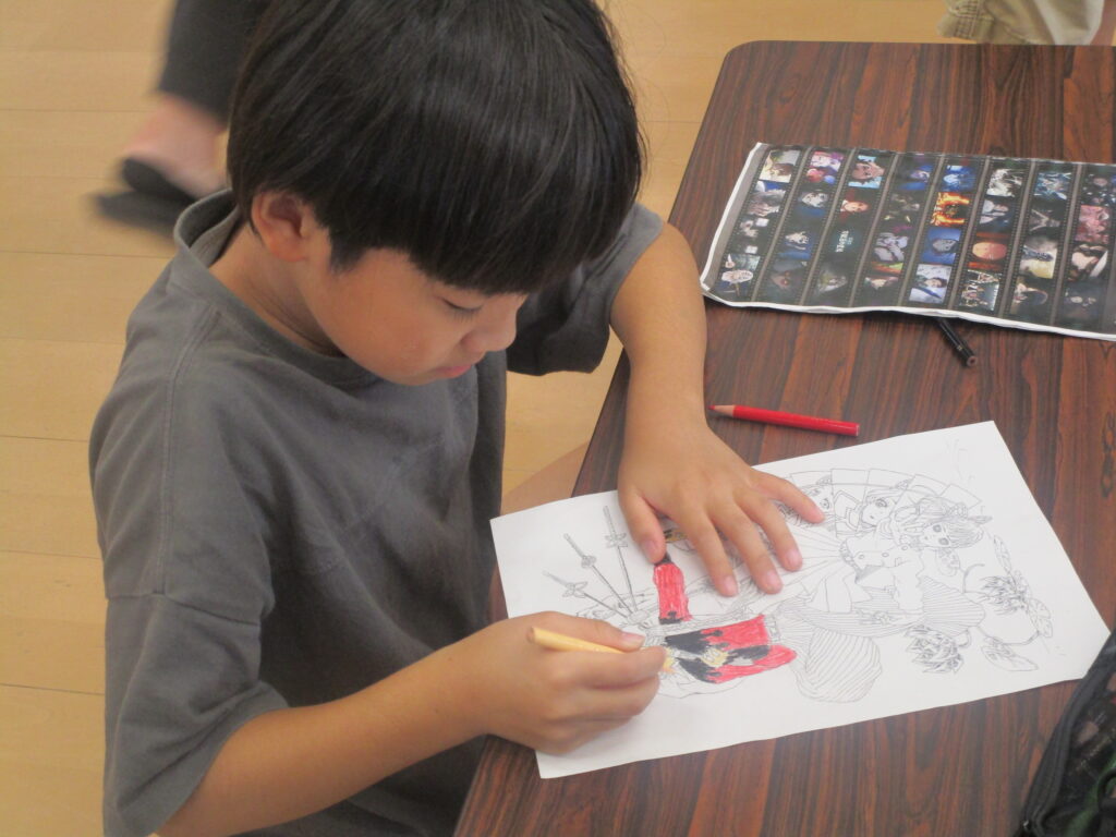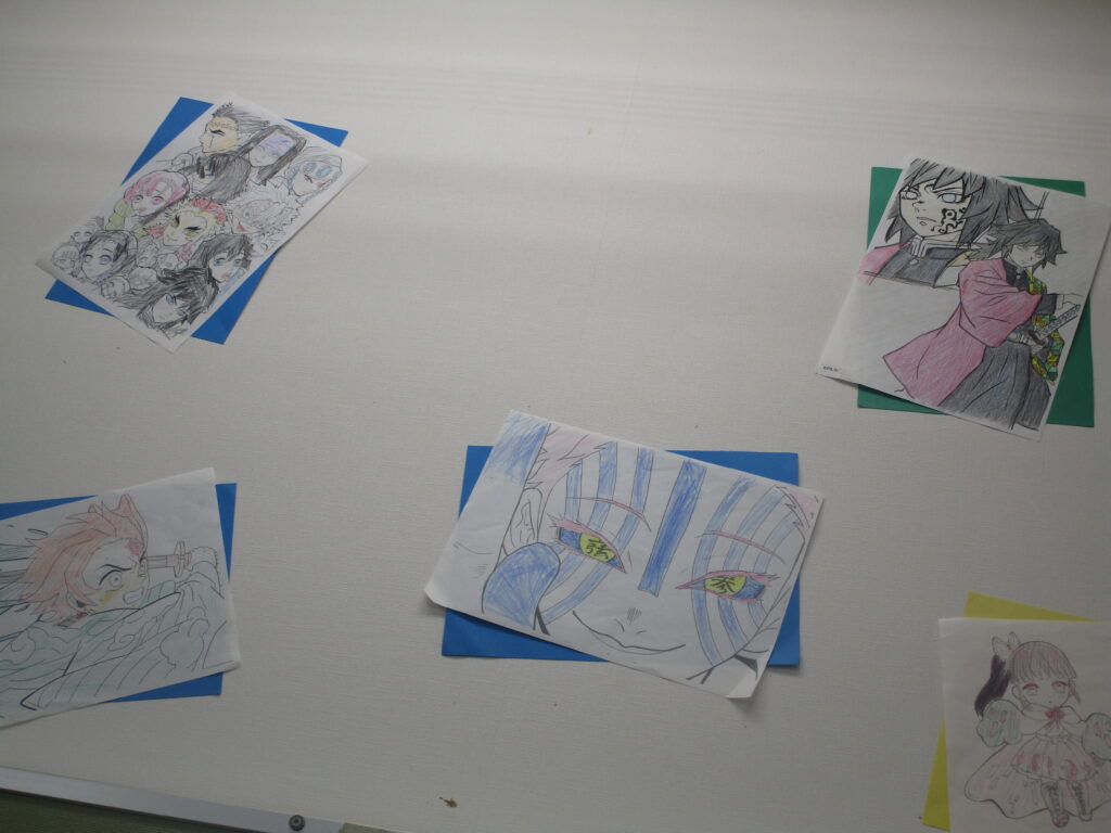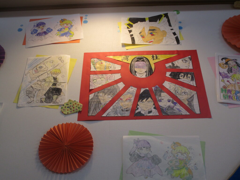 テーマにちなみ、壁面装飾は『鬼滅の刃』のぬりえをこども達の制作です。